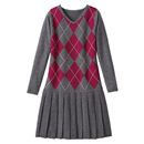 前身頃のアーガイル柄や旬のローウエスト、スカートのプリーツが優等生ディテールのワンピ。Vネック+細シルエットで大人っぽく着られるのも◎。