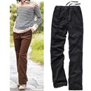 強力ヨコストレッチとウエスト総ゴムではき心地ラクラク。適度にハリのある織物素材がきちんと感を出しながら、のびのびパンツにありがちなムチムチ感を軽減。