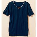 シンプルなクルーネックのツインニット。レーヨン混でしなやか素材。半袖ニットは前身頃がチェック柄。カーディガンのボタンは金縁パール調でレディライク。