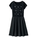 前身頃のビジューが華やかな変わり編みの上身頃に、すっきりギャザーのフレアスカート。表情豊かなワンピはブラックで使いやすく。