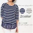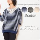 胸元のレースが女性らしく可愛いボーダープルオーバー。上品なレース使いとゆったりシルエットで普段使いに重宝します。