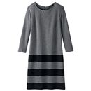 しっかりめのカットソー素材で着心地の良いワンピースを3スタイルで。Aは、グレー×ブラックの落ち着いたボーダー柄で、アクセいらずの衿ぐりビジュー使い。