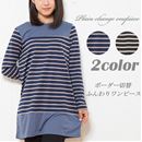 2枚重ねの接結素材が、首元からお尻まわりまでふんわり包み込みます。カフスと裾のピッチ違いのボーダー使いがポイント。