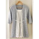 綿ブラウスに杢調ニット風のカットソーカーディガンを重ねたような異素材使い。裾のコットンレースがナチュラルな雰囲気に。