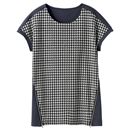 前カットソー&後ろ異素材切り替えがおしゃれ。後ろ長め丈でヒップもカバー。裾スリットにタブボタン留めでアクセントに。