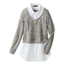 シャツとあたたかみのあるカットソーの重ね着風コーデが1枚で決まる優秀アイテム。襟ぐりのビジューがアクセいらずの華やかさ!チュニック丈でパンツに好相性。