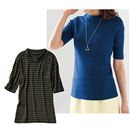 伸びのよい薄手のオフタートルカットソーは重ね着にも大活躍。首回りゆったり設計だかららくちん。衿元と袖口のシャーリングがポイントです。