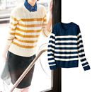 布帛の衿が付いた薄手ボートネックニット。人気の編み地ボーダー、スポーティーな印象のストライプ、旬なケーブル編みの3タイプ展開。