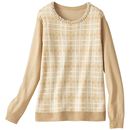シャギーチェックにきらきらビジューを散りばめた個性的なニット。ベージュ×ブラックの甘すぎないカラーも上級者っぽい雰囲気。