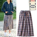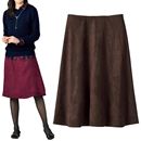 おなかまわりをすっきりと抑えたひざ下丈の台形スカート。ウエストの動きで食い込まないよう、ウエスト両脇にゴムを挟み込みました。