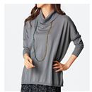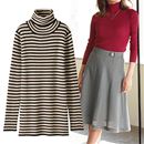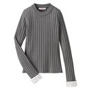 伸縮性のよい編地で体にぴったり沿い、重ね着してもモタつかないすっきりリブ編みニット!。ふんわりボトムと合わせてメリハリのあるスタイリングに。