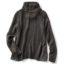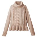 フロントにケーブル柄を編み込んだニット。程良く詰まったタートルネックやふわっと広がるペプラム裾などのディテールにトレンドが凝縮。