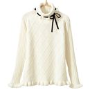 フリルディテールに衿元のベロアリボンが大人フェミニン。身頃と袖の編地を変えたこだわりデザイン。いつまでもときめきを大切にする大人のあなたに、パウダーシュガーのように甘いフェミニンエレガンスを贈ります。…