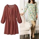 透け感の少ないきれいめ素材を使ったプリントチュニック。花柄のブルー系と幾何柄のオレンジ系はウエストのタックがポイント。