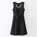 フロントはシンプルながら、バックはジョーゼットが覗くエレガントなデザイン。襟ぐりの配色ブラックと後ろ中心のリボンが小粋なアクセント。
