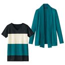 すぐ着られる半袖Vネックはキャッチーな太幅カラーブロック。トッパーカーデはボタン留めでカシュクールにもなる2WAY。