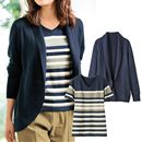 ヒップがかくれるロング丈で気軽なジャケットタイプのカーディガンとカジュアルな印象のVネック半袖ボーダーニットのワザありツインニット。