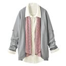 カーディガン、スカーフ、レギュラーシャツの3点セット。羽織るタイプのエレガントなカーデはオンタイムにもおすすめ。