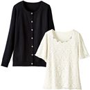 華やかなレース使いの半袖プルオーバーとカーディガンのセット。プルオーバーは衿ぐりにパールとビジューが輝き、存在感をアピール。