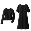 顔周りをすっきりと見せるノーカラージャケットとシンプルなAラインを描く上品なワンピースのアンサンブル。