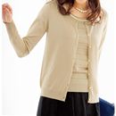 ケーブル編みのカーディガンと、シンプルなインナーのアンサンブル。インナーの衿ぐりはパール調ビーズとビジュー付きで単品でも着回しが効く優れものです。