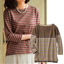 トレンドのワイドピッチボーダーにも注目!!裏側を軽く起毛した天竺素材で、柔らかな肌触りと暖かさ。衿ぐりの後ろは、サテンテープパイピングを施し、しっかり補強しています。