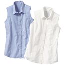 シンプルなノースリーブのシャツなら、もたつくことなく重ね着が可能に。ニットや軽いアウターの下にあわせて軽快に着こなして。