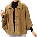 表側は暖かな風合いのカットソー、裏側はフラットな天竺素材。2枚の生地をボンディングしたしっかり感のある素材で作ったポンチョ。衿部分は、折り返すと裏側の配色が見えるオフタートルです。