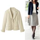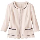 裾のスカラップと配色のパイピングが女性らしいノーカラージャケット。袖口はスリット入りで、折り返してもOK。
