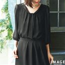 デコルテがきれいに見える広めの襟ぐりに、ボウタイがきちんとした印象をプラス。程良い抜け感のある7分丈のパフスリーブがフェミニンな雰囲気に。