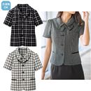 ボタンで取り外し可能なフリルタイ付きの、ジョーゼット素材の半袖ブラウス。制服、事務服として活躍。(オフィスウエア)