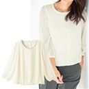 袖口を折り重ねえ二の腕をカバーするVネックブラウス。両裾はスリット入りで、裾をアウトさせてもキレイに着られます。