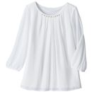前身頃のたっぷりギャザーで、ふんわりとしたシルエットに。胸元のビジューがアクセント。身頃には伸縮性のあるカットソーの裏地付きで安心。