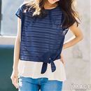 ヘルシー可愛い透け感素材。シアーボーダー柄のトップスを重ね着したようなレイヤード風デザインが魅力。ジョーゼットで切り替えた裾と結びリボンが愛らしさをプラス。