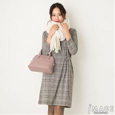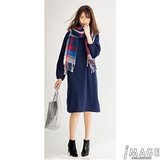 千鳥柄と幾何柄を、前身頃に部分使いした細見えデザインのワンピースです。やや起毛させた暖かみのある表面感で肌触りも柔らかな素材を使用しています。
