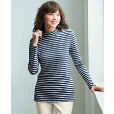 衿や袖口、裾のメロー始末が女性らしいプルオーバー。1枚はもちろん、インナーとしても活躍できるボーダーアイテムです。