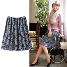 フロッキープリントを施したような、千鳥×花柄のスカート。カットソージャカード素材なので、伸縮性がありはき心地◎。