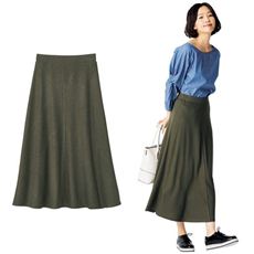 腰まわりはすっきり、緩やかに広がるラインが上品な印象のミラノリブスカート。ウエストは太めリブ&総ゴム仕様で楽々。
