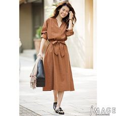 キレイめで薄手のポンチ素材のワンピース。ウエスト切り替え&タックで、フェミニンなフレアシルエットを演出しながら縦のラインを強調してすっきり。