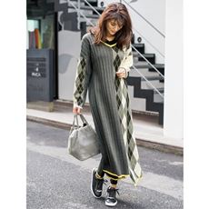 ワイドリブ編み&アーガイル柄で切り替え、イレギュラーヘムで仕上げたニットワンピース。すっぽり着るだけで即おしゃれに決まる。
