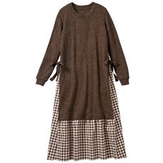 杢調のニットソーチュニックと、ギンガムチェックのシャツ地のスカートをレイヤードしたようなワンピース。