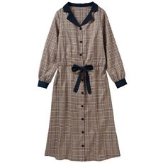 トレンドのチェック柄を使ったシャツワンピース。衿、袖口、ウエストのリボン、ボタンは配色でメリハリをプラス。