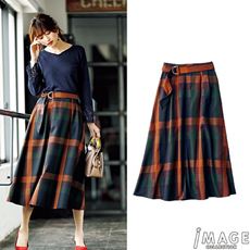 大きめのチェック柄がトレンド! 動くたび揺れるフレアスカートはミモレ丈がレディな雰囲気。共地のDカンベルト付き。