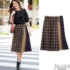 3種類のチェック柄と異素材の組み合わせが存在感たっぷり!一枚でコーデが盛り上がるラップ風スカート。後ろファスナー仕様で着脱もラクチン。