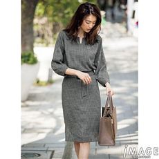 KEYネックやパフスリーブが上品なトップとひざ下丈タイトスカートのワンピ風セットアップ。共地ベルトでウエストをマークしてレディに装って。