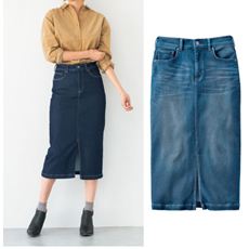 センターの切り替えがすっきり見せるシンプルなデニム風スカート。なめらかな肌ざわりで、伸縮性も楽ちん。