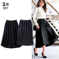 フロントボタンのフレアスカートと、レースのタイトスカートの2点セット。単品使いはもちろん、重ねれば裾から覗くクラシカルなレースがポイントに。
