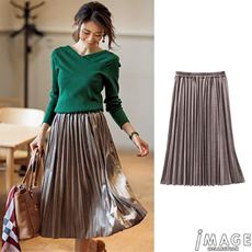カットソーベロア素材にアコーディオンプリーツをかけ、エレガントに仕立てたスカート。歩くたびに揺れてメタリックのようにきらめく姿が素敵。