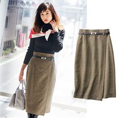 英国調のヘリンボーンツイード素材とひざ下丈のラップ風デザインが上品かつ今っぽいタイトスカート。ハイウエスト&セットの黒い細ベルトがウエストラインをすっきり見せ。
