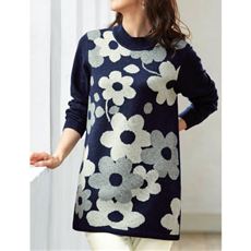 Aパターンはネイビーの地に咲いた白い花が清々しいハイネックチュニックです。Bパターンは季節をまとうように雪の結晶をあしらったフォークロア調ニットです。